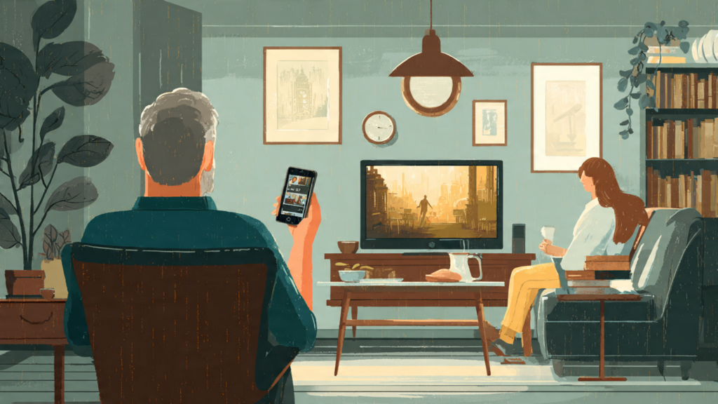Homes act as echo chambers. A quote plays on a screen while someone cooks. The sound drifts into hallways and becomes part of routine.